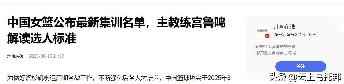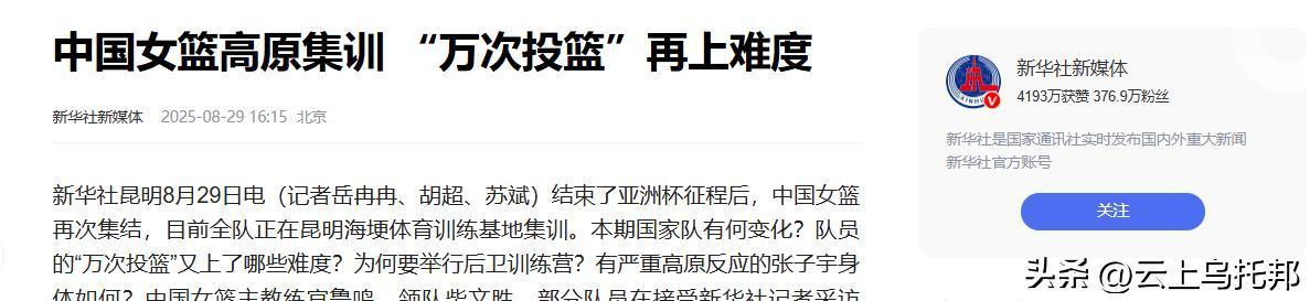 信息来源:新华社新媒体 2025-08-29 中国女篮高原集训 “万次投篮”再上难度北晚在线 2025-08-15 中国女篮公布最新集训名单,主教练宫鲁鸣解读选人标准